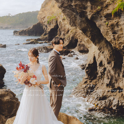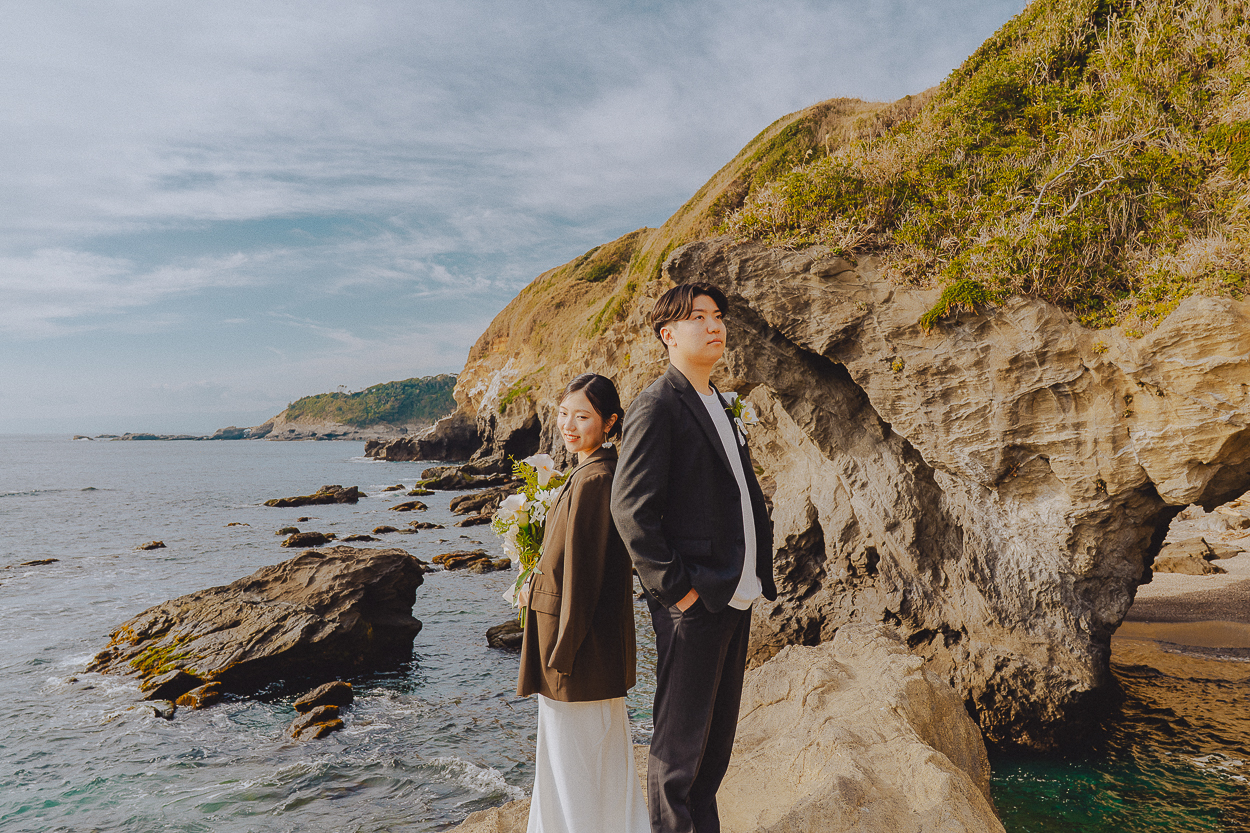 城ヶ島は自然が強いロケ地なので、シンプルなドレスほど映えます。